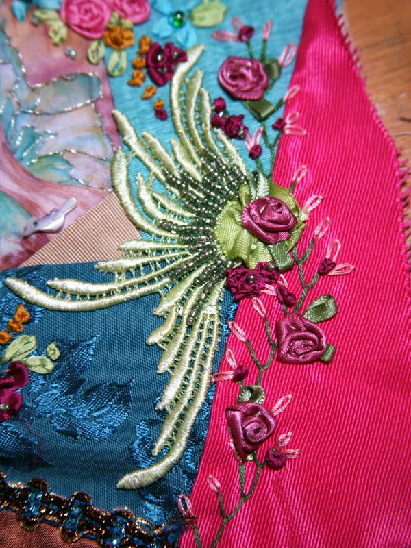 Here is the whole block finished. I got to thinking what if she gets mad because I didn't share the whole block? I did use some silk sari ribbon I had and the trim at the top left has mirrors in it, just something fun. The black pretties on the right is from a bracelet I deconstructed ( how do you like that word instead of tearing up? ) from an estate sale.